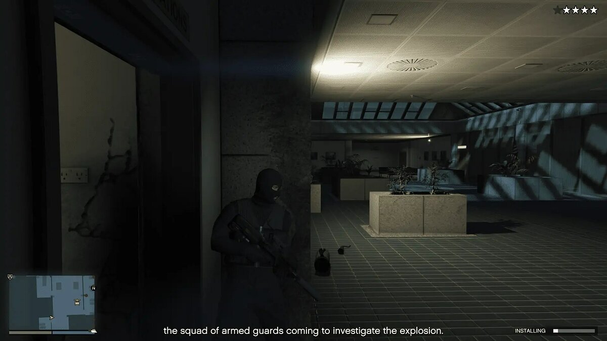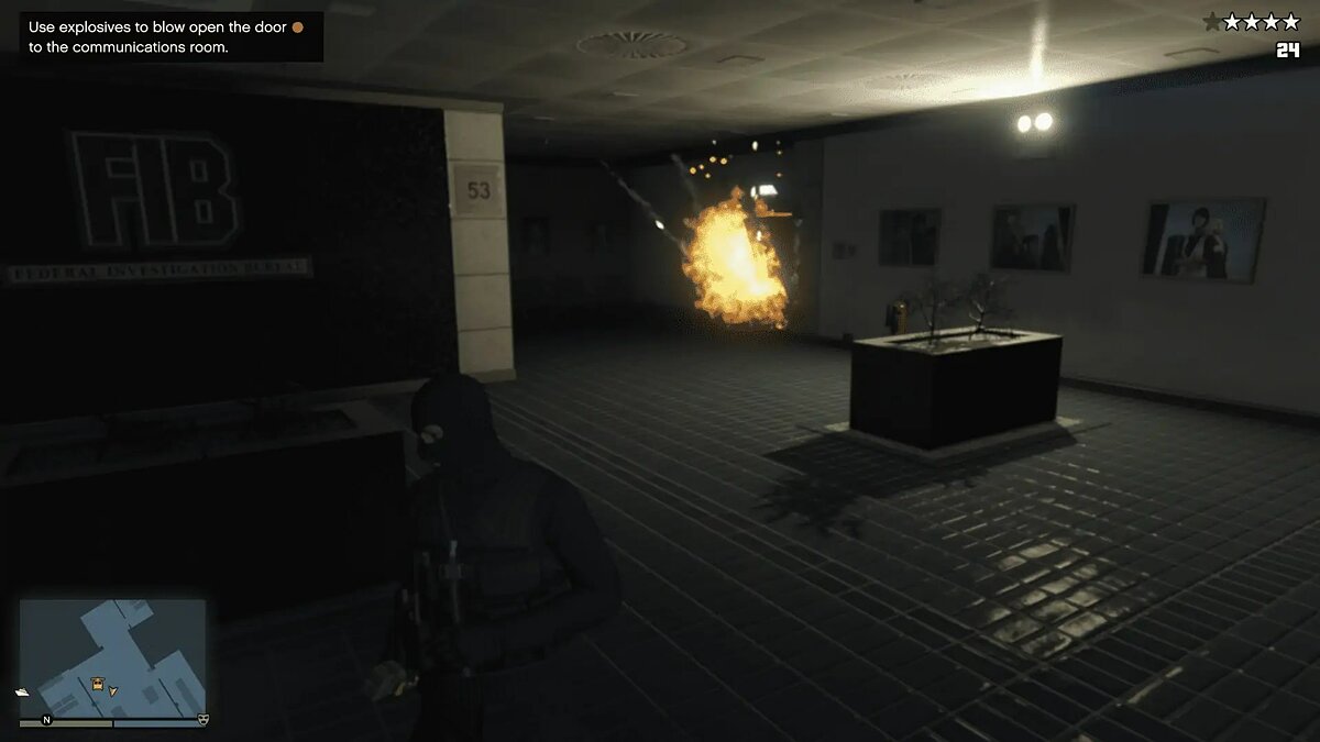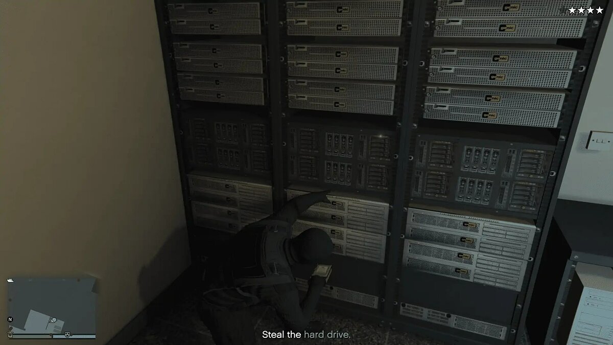Войдите в комнату и взаимодействуйте с компьютером, чтобы вставить в него USB-накопитель. Вам потребуется отстреливаться от агентов FIB, пока идёт процесс работы программы. За прогрессом вы можете следить в правом нижнем углу экрана.