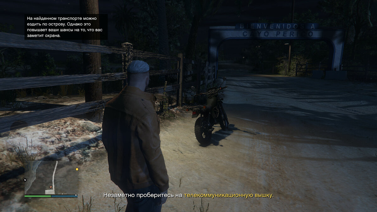 Итак, чтобы добраться до пункта назначения максимально быстро, берем мотоцикл, который находится рядом с табличкой «BIENVENIDOS A CAYO PERICO».