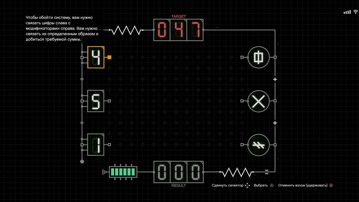 Нашли распределительный щит? Отлично! Теперь его нужно взломать. Перед нами мини-игра, где у нас есть число сверху (на скриншоте это число 47). Наша задача — получить такое же число из чисел (слева) и модификаторов (справа). Полученное нами число отображается внизу.