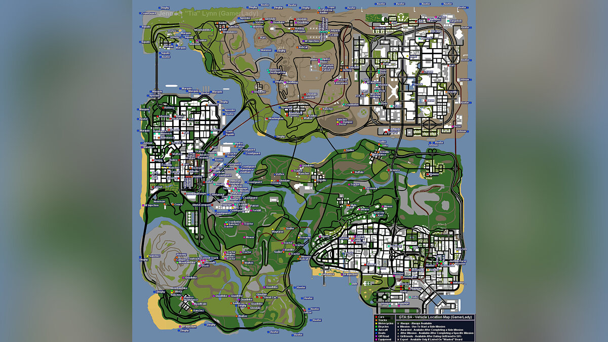 Карта машин, лодок, мотоциклов и другого транспорта GTA San Andreas