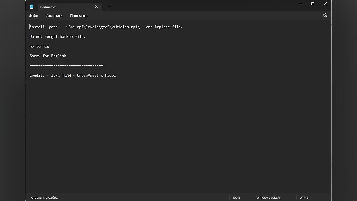 Примечание: При добавлении каждого мода на замену транспорта в GTA 5 с помощью метода Replace возможны различные вариации для путей к файлам. Однако важно добавлять соответствующие файлы в папку «mods» перед внесением изменений, даже если в Readme указан путь без этой папки.