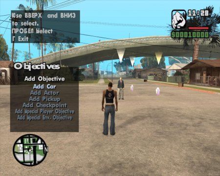 Objectives - Это самый главный пункт в DYOM'e, который отвечает за всю миссию. То есть вы не сможете поиграть в вашу миссию без этой функции. Она расставляет главные цели: такие как чек-поинты, сесть в машину, убить актера, взять предмет, катсцены, тайм-аут с текстом и прочие метки