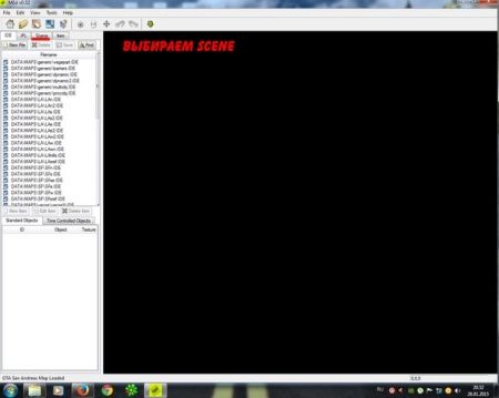Жмем ОК. После того, как эта вкладка убралась, мы снова нажимаем ОК. После этого у нас проходит небольшая загрузка, ждем ее окончания. Далее перед нами сбоку вылезло очень много папок, и 4 вкладки (IDE, IPL, Scene, Item). Мы выбираем вкладку Scene.