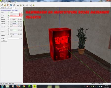 Перед нами вылазит множество интерьеров, которые есть в игре. Мы продвигаемся в любой из интерьеров и находим то, что будем изменять. В моем случае это Sprunk в отеле Jefferson. Итак, мы двойным щелчком мыши пометили объект и теперь вылезла графа с координатами и названием объекта, но названия объекта тут нет. Что мы делаем в этом случае? Нажми возле названия объекта на многоточие.