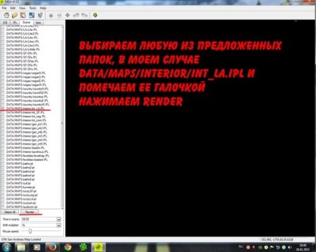 Перед нами вылезло очень много файлов, которые содержатся в папке DATA и относятся к карте в игре. Нам необходимо выбрать один из них; я выбираю файл DATA/MAPS/interior/int_LA.IPL. Помечаем нами выбранную папку галочкой и жмем Render.