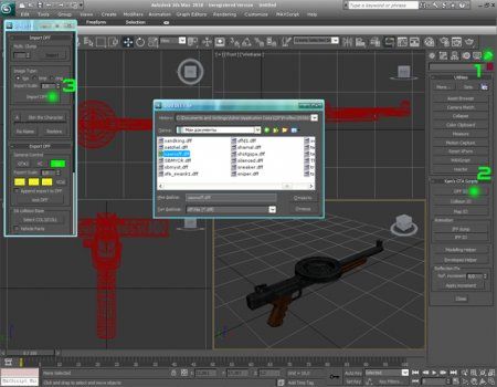 Теперь импортируем модель, которую вы хотите заменить в игре. Для этого выбираем последнюю вкладку, свиток Kam's Script, нажимаем DFF IO, в появившемсе окне жмём Import DFF, находим модель и делаем на ней двойной щелчок.