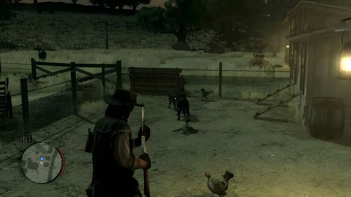 Приняв смену, шериф оставит вам в качестве напарника и путеводителя пса. Следуйте за ним, чтобы найти и отстрелять койотов, которые завелись в курятнике.