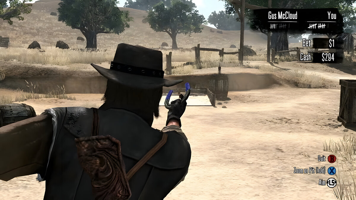 Третью часть одежды можно получить, выиграв в метании подков на ранчо Макфарлейн. Держите путь к отмеченной точке на карте, чтобы начать играть.