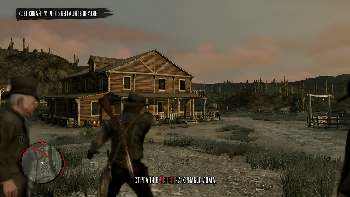 Добравшись до обозначенного желтой меткой на карте места вы увидите, как Диккенс нагло обманывает поселенцев фермы, выдавая свое свое «лекарство» за напиток, который вернет молодость. А главного героя он будет представит в качестве пациента, принимающего этот напиток. Чтобы доказать это остальным, нужно метко попасть в череп на крыльце дома.