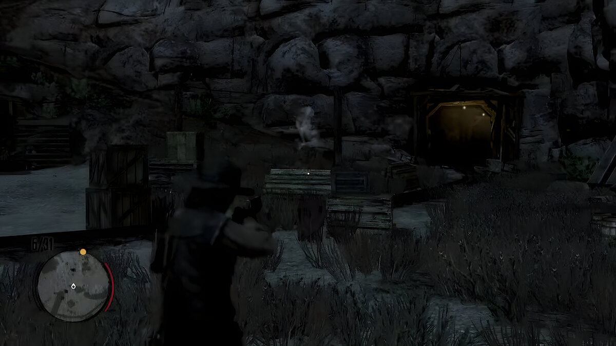 Следующая задача — найти путь в шахту. Проберитесь внутрь лагеря и зачистите его от бандитов, что охраняют спуск внутрь. Саму шахту вы найдете в конце лагеря, она также отмечена желтым маркером на карте.