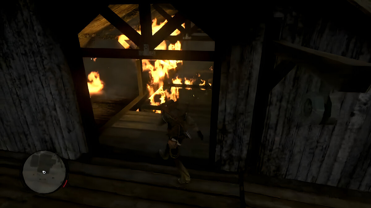 Горящее здание — это сарай. Доберитесь до него, обойдите слева и заберитесь внутрь, используя чердак.