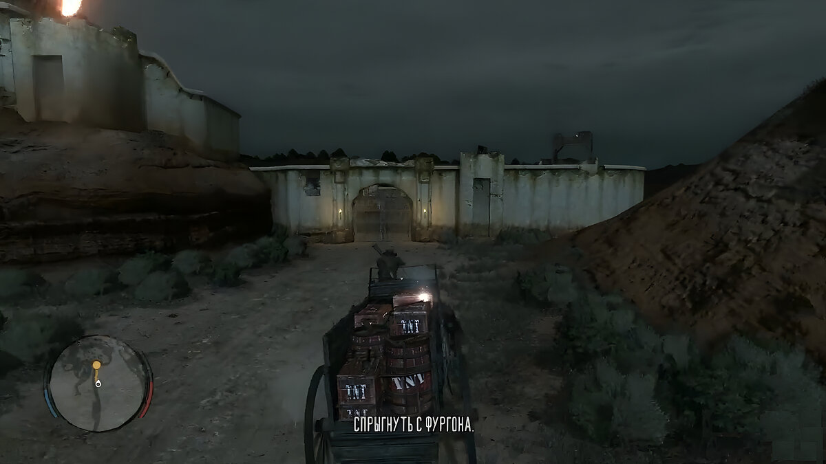 Посмотрев катсцену, отправляйтесь в повозку с Рейесом. Он приведет вас к форту, где находятся желаемые вами бандиты. Его план — отвлечь людей бандитов со стороны входа в форт, а вы в этот момент будете ехать к воротам вместе с пятью ящиками тротила.