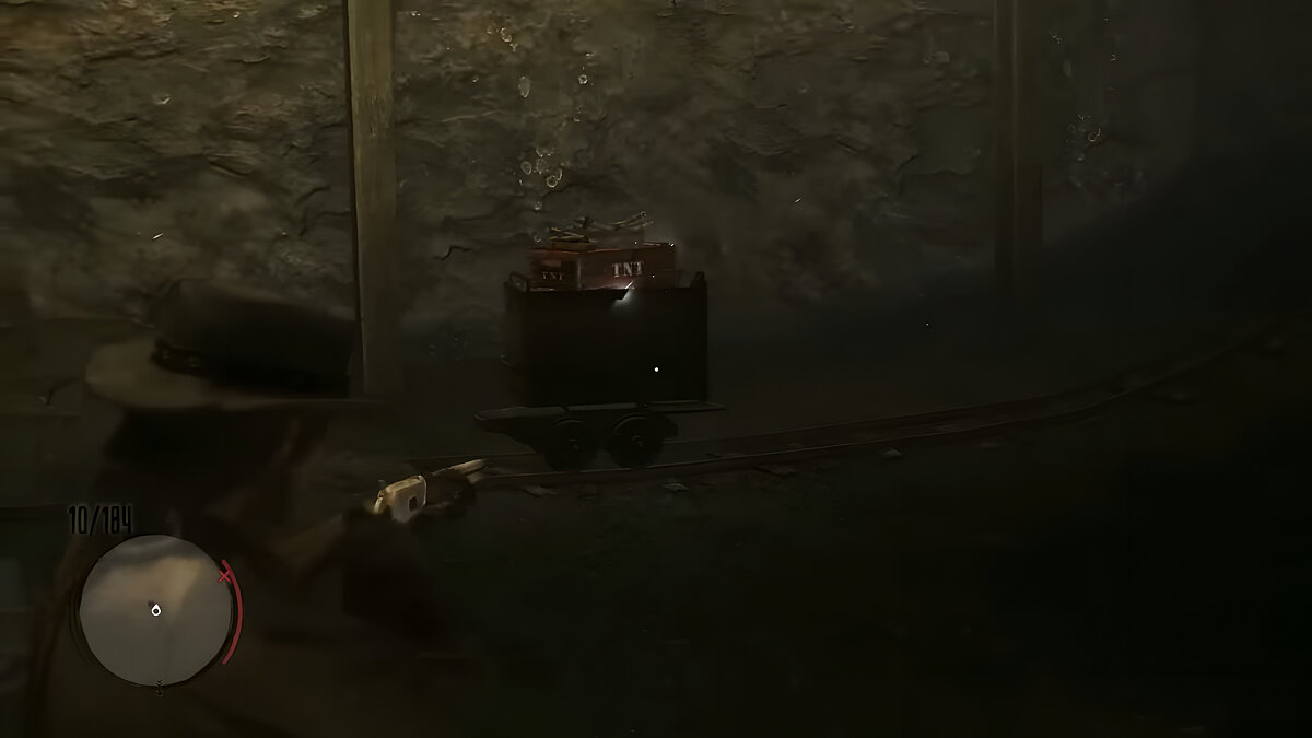 Следуйте за индейцем в пещеру, где на вас нападет неизвестный безумец. Пристрелив его, вы заметите, что к месту, где вы находитесь, приближается вагонетка, полная взрывчатки.