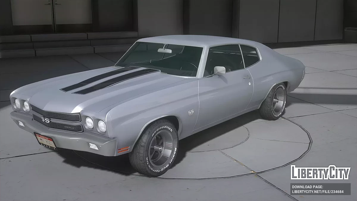 1970 Chevrolet Chevelle SS Передняя часть: Длинный капот украшен двумя выразительными чёрными полосами, придающими автомобилю агрессивный и спортивный вид. Классическая прямоугольная решётка радиатора с интегрированным шильдиком "SS" п...