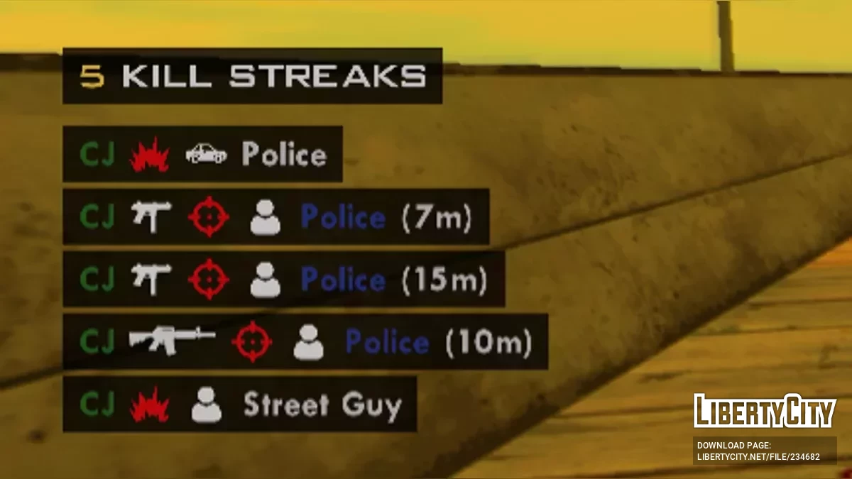 Этот мод просто добавляет отчет об убийствах слева на экране, когда игрок совершает убийство или уничтожает транспортные средства. Он отображает некоторую информацию, такую как тип урона, который использовал игрок, убитый пешеход или транспортное сре...