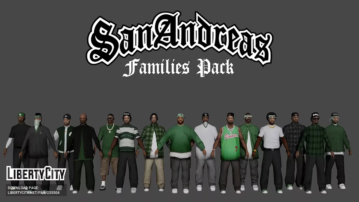 Этот мод добавляет пак новых скинов банды для GTA San Andreas. Скины выполнены в стиле оригинальной игры и хорошо вписываются в атмосферу Сан-Андреаса. Персонажи носят зелёную одежду, банданы, кепки и другие элементы классического стиля Grove Street....