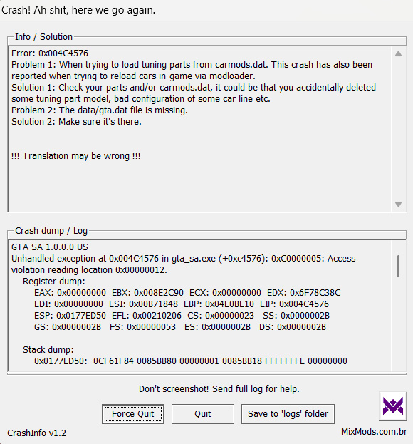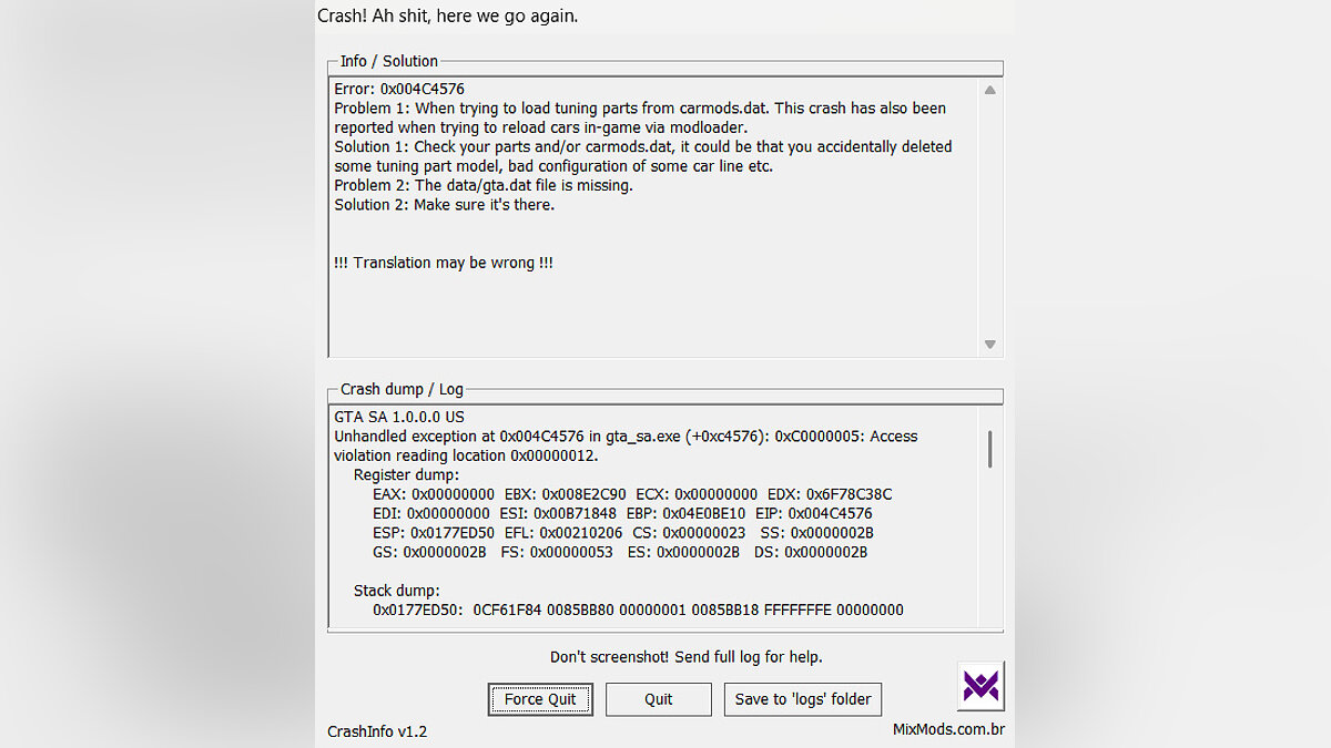 about: It may be some script that tried to load a non-existent model, for example some script that uses an animal model and creates using cleo, if the animal model is not installed it will crash this dll. This crash can also be easily encountered when using Skin Selector with bad skin installation, such as when installing skins with very long names (warned in Readme to use names with a maximum of 7 letters). Not only skins, anyway, this crash is caused by models in general and not only scripts, it can also be caused by map mods missing .dff .txd and .col etc files, usually the lack of these files in some mod causes the crash on this dll.