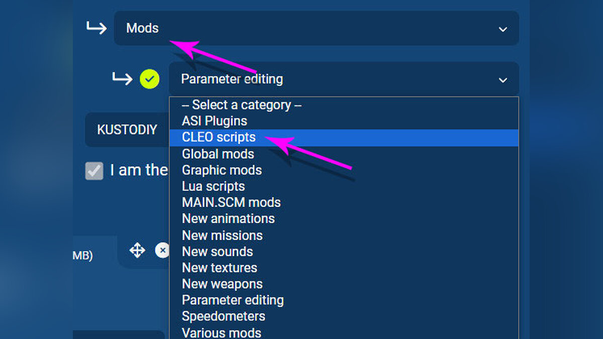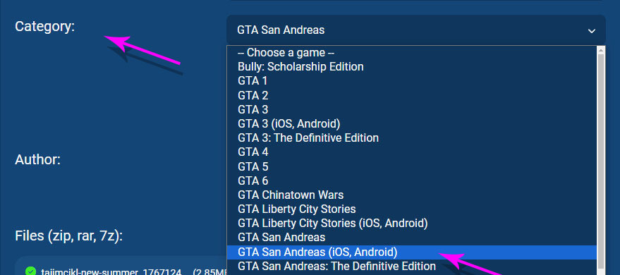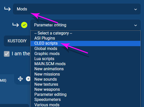 • Go to "My Files" (by clicking on the profile icon at the top) • Click the gear icon to the right of the title • In the category, select "GTA San Andreas (iOS, Android)" • Subcategory: "Mods" • Additionally, "CLEO Scripts" • Click the "Submit" button at the bottom of the page