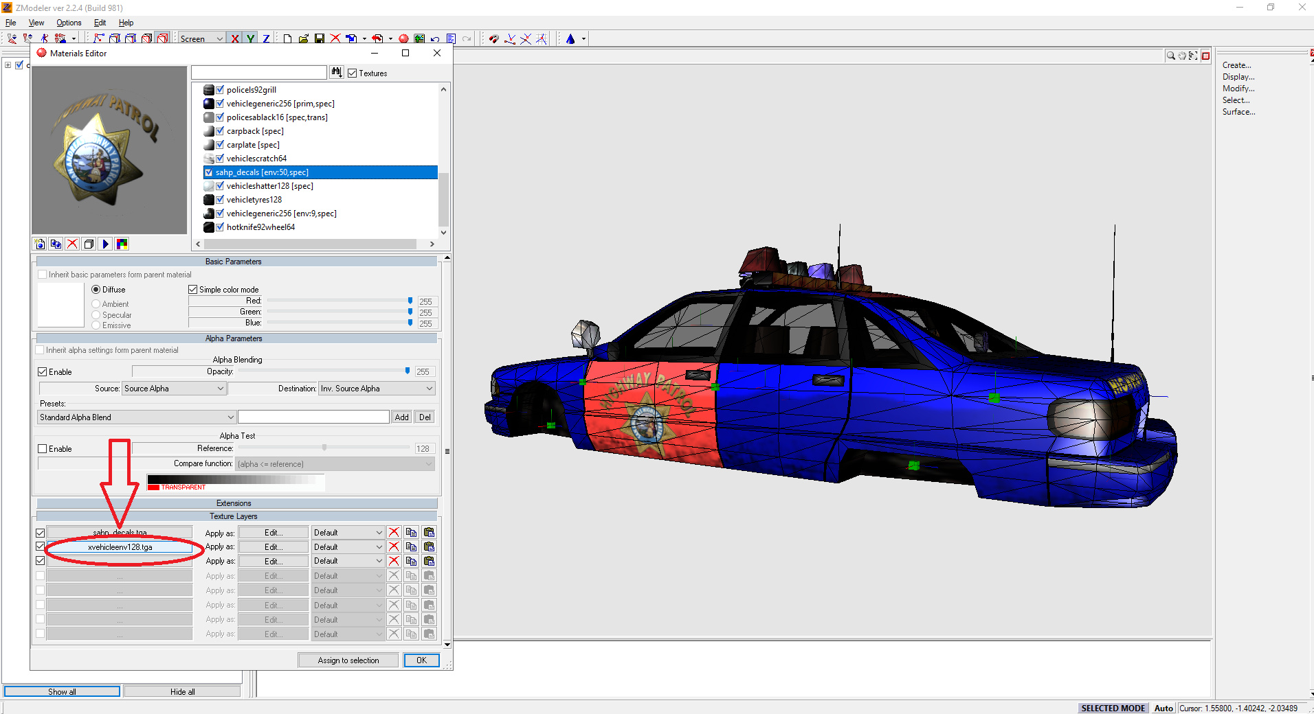 If someone uses skygfx with the PS2 reflections on the cars I recommend to delete the "xvehicleenv128" (2nd option in the image) from the "SAHP_decals" beacause with will look so bright. I used Zmodeler2, you will need to first open the textures exported to .tga. Those are the textures from the original vehicles.txd and later export all the copcaravg.txd file textures too. Then you import the car and then delete what i said before.