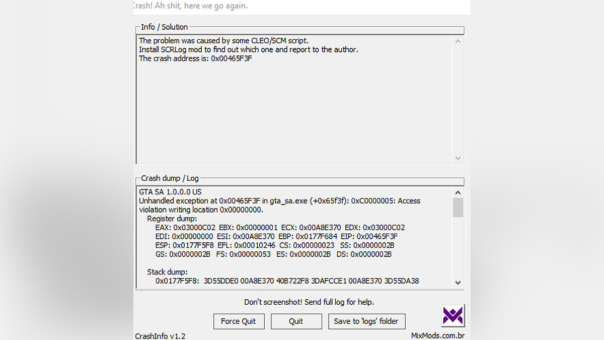 Eu estou usando o crash info. Meu jogo trava e diz a seguinte frase. Error: 0x00734E5A Problem: TXD missing or incomplete or buggy or some mod tried to load some texture or some model that doesn't exist.