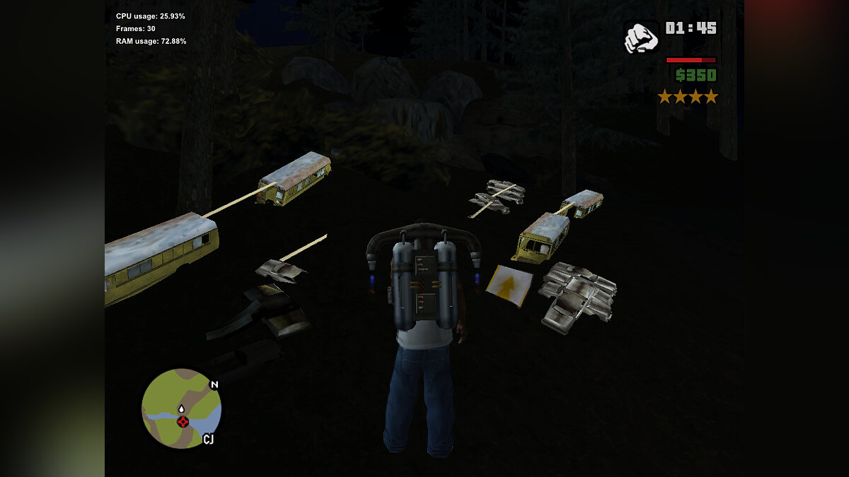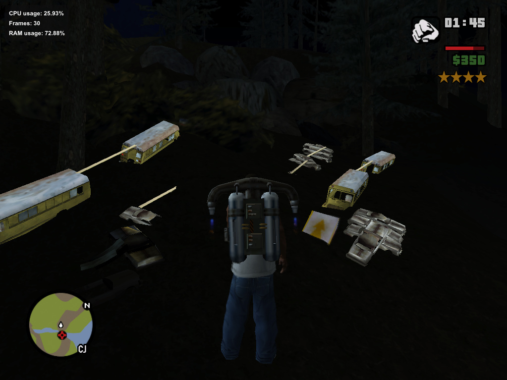 Tambien encontre en el bosque de san fierro, unos autobuses abandonados que en la noche brillan con otras chatarra. La silal de ruedas la pude reemplazar por otro modelo, pero estas cosas no se reemplazarlas para arreglarlas, ojala puedan solucionarlo y hacerlo compatible con propers fixer, por que me di cuenta que fastloader funciona perfecto, me anda muy bien el juego, pero estas pequeñas fallas hay que repararlas.