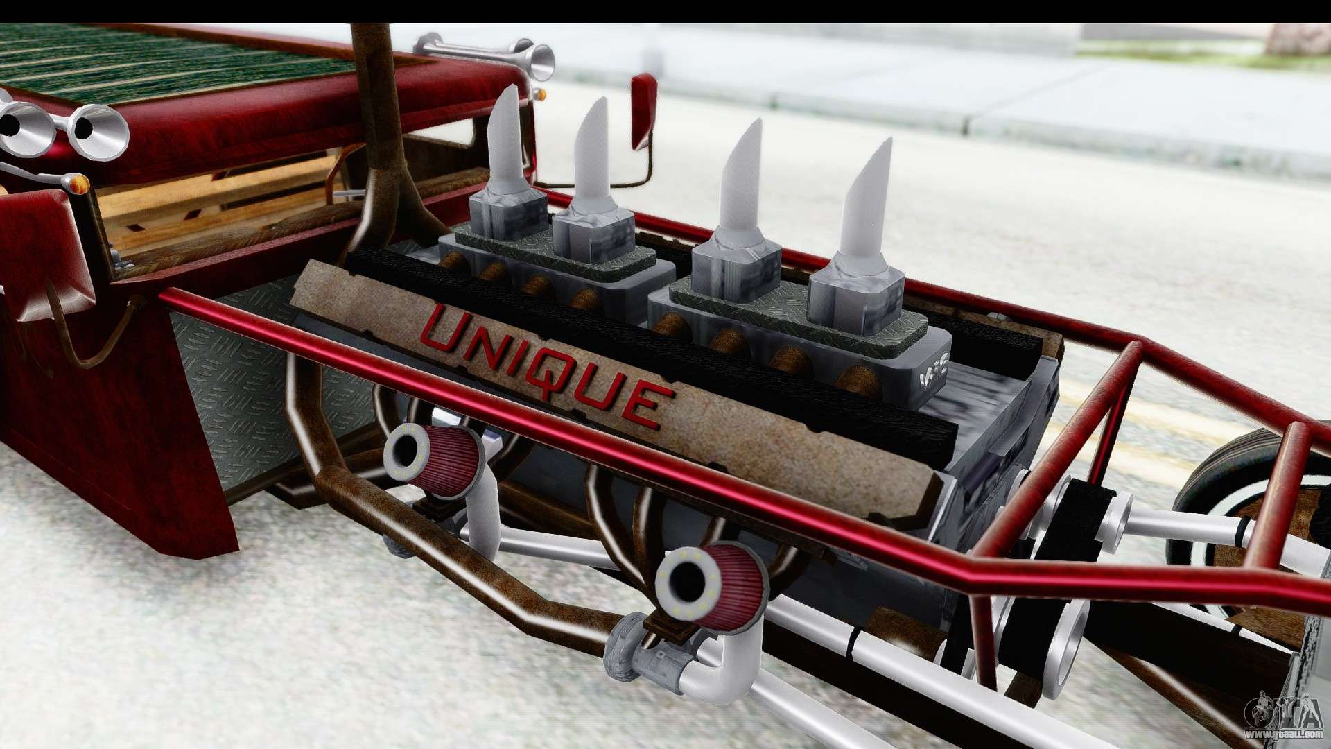 This man have a very good V16 engine , weirdest part is this engine is doesn't make any sense, turbocharged or what?. Just make it run on 16 ITB's, fix the headers and exhaust, lower the polygon and texture to match gta sa vibes