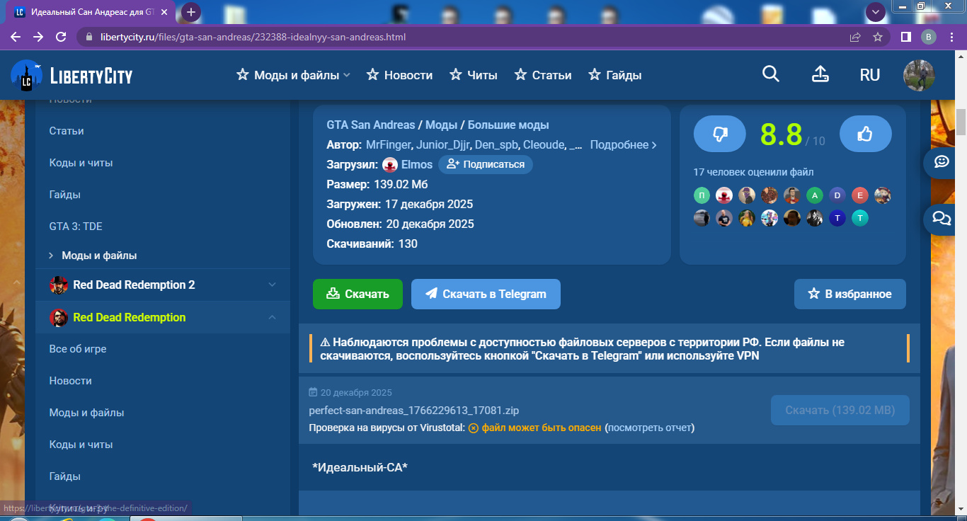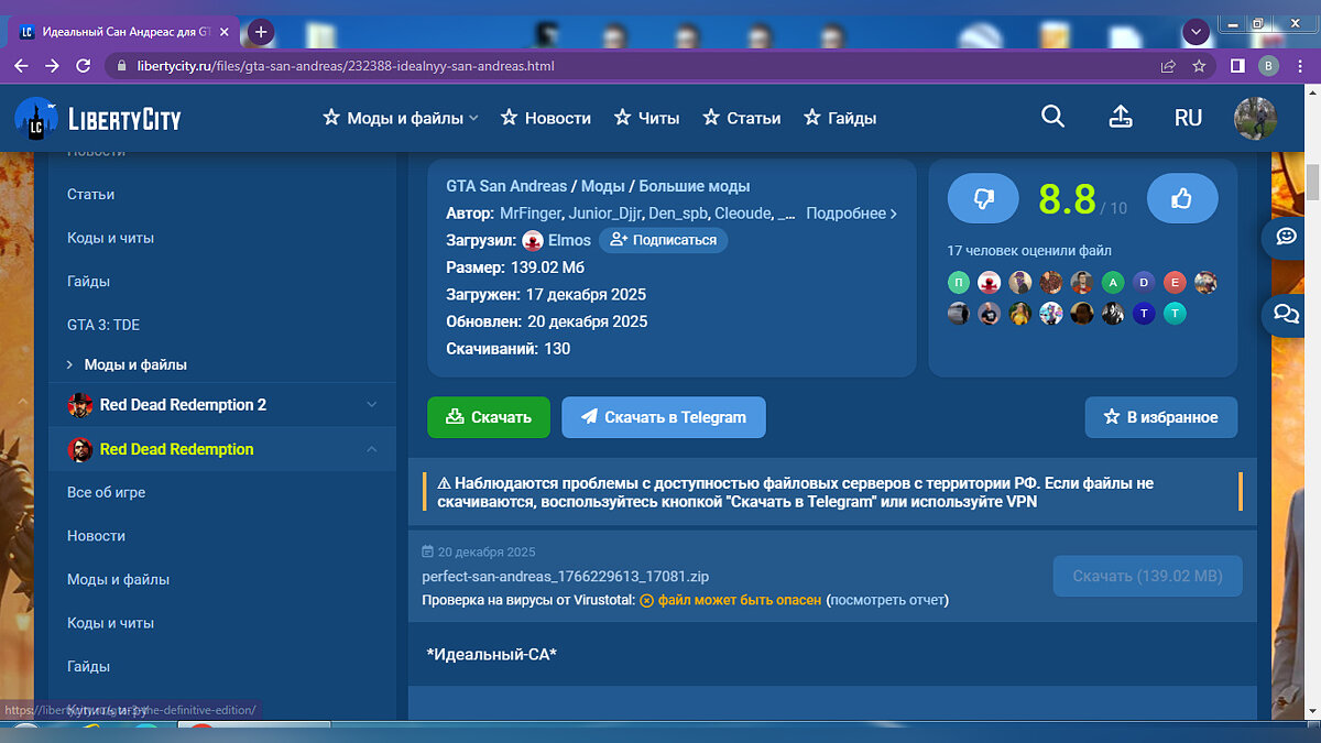 I just updated the through Libertycity.NET which caused the problem. I did not use libertycity.RU. But dont worry the problem will be fixed in a matter of time. Dont worry the file is safe, it's just a problem with the website.