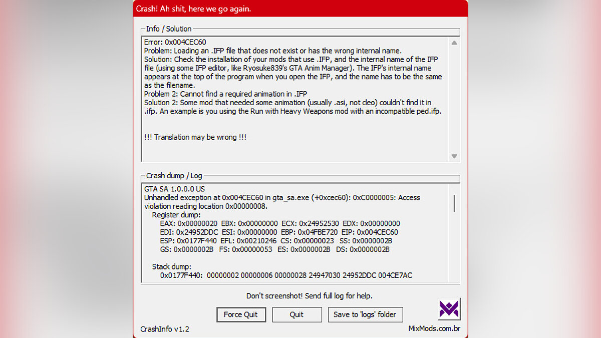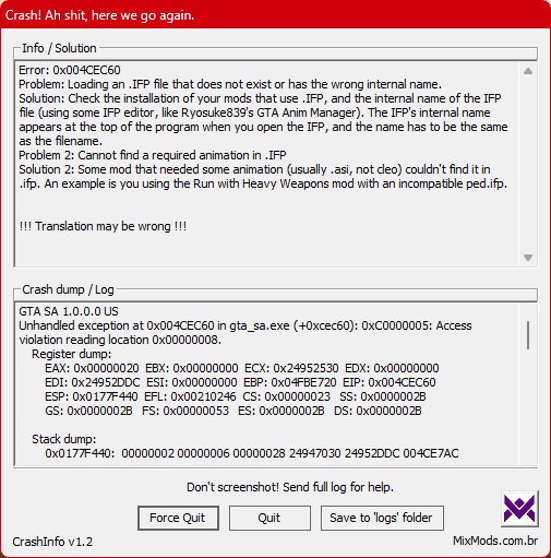Hola, estuve probando el mod, y por algun motivo extraño, con el mods de (Artem.1.9.9.6) -Newspapers -Rubbish like in GTA 4 En las calles se empiezan a incendiar sin motivo alguno, la verdad no entiendo por que, no se si podes probarlo y solucionarlo.