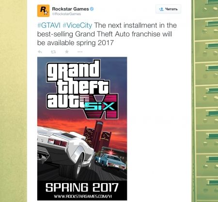 Несколько минут назад в официальном твиттере Rockstar Games появился анонс следующей игры в серии Grand Theft Auto. Судя по обозначенным тегам и опубликованному арту, игра будет называться GTA 6 и вернет игроков в Вайс Сити, но сеттинг будет намного мрачнее, чем в оригнальной GTA Vice City. В сообщении говорится, что игра будет доступна весной 2017 года.