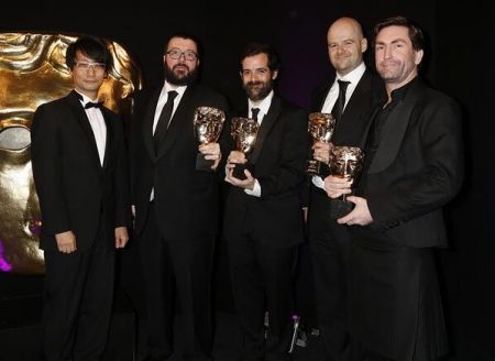 Слева направо: Кодзима, Гарбут, Сэм Хаузер, Дэн Хаузер, Лесли Бензис на церемонии вручения премии BAFTA Game Awards в 2014 году