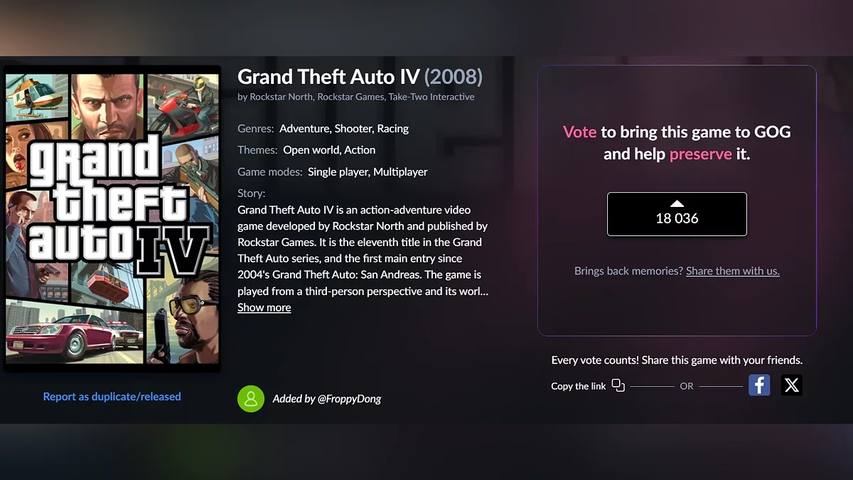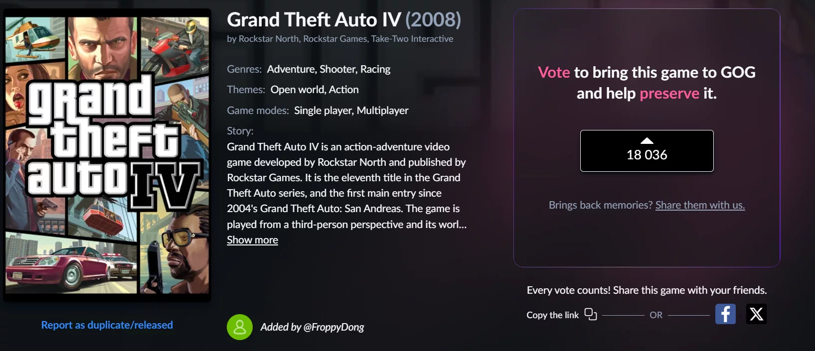 Естественно, даже если голосование наберет рекордное количество голосов, это вовсе не гарантирует выпуск GTA 4 в GOG. Однако это может показать Rockstar Games, насколько сильно геймеры хотят, чтобы игра появилась на цифровой площадке CD Projekt.