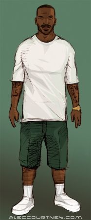 "Я хотел, чтобы он прекрасно вписывался в мир игры наравне с Франклином", - пишет Алек на GTAForums. - "Я подумал, что нужно сделать модель постаревшего CJ, чтобы при взгляде на него вы сразу могли его узнать. Одежда [на первом рисунке] прекрасно подходит для гангстерской культуры. Я думаю, что майка и синие джинсы были бы слишком банальными. Я хочу, чтобы люди узнавали его по лицу, а не по одежде. Также я считаю, что у него должно быть среднее телосложение. Некоторым людям не нравится играть за громилу, а другие не любят играть за мешок с костями".