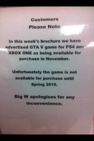 "Покупатели, пожалуйста заметьте! В брошюре, выпущенной на этой неделе, мы сообщили, что GTA 5 будет доступна для PS4 и Xbox One в ноябре. К сожалению, игра не будет доступна до весны 2015 года. Big W извиняется за возможные неудобства".