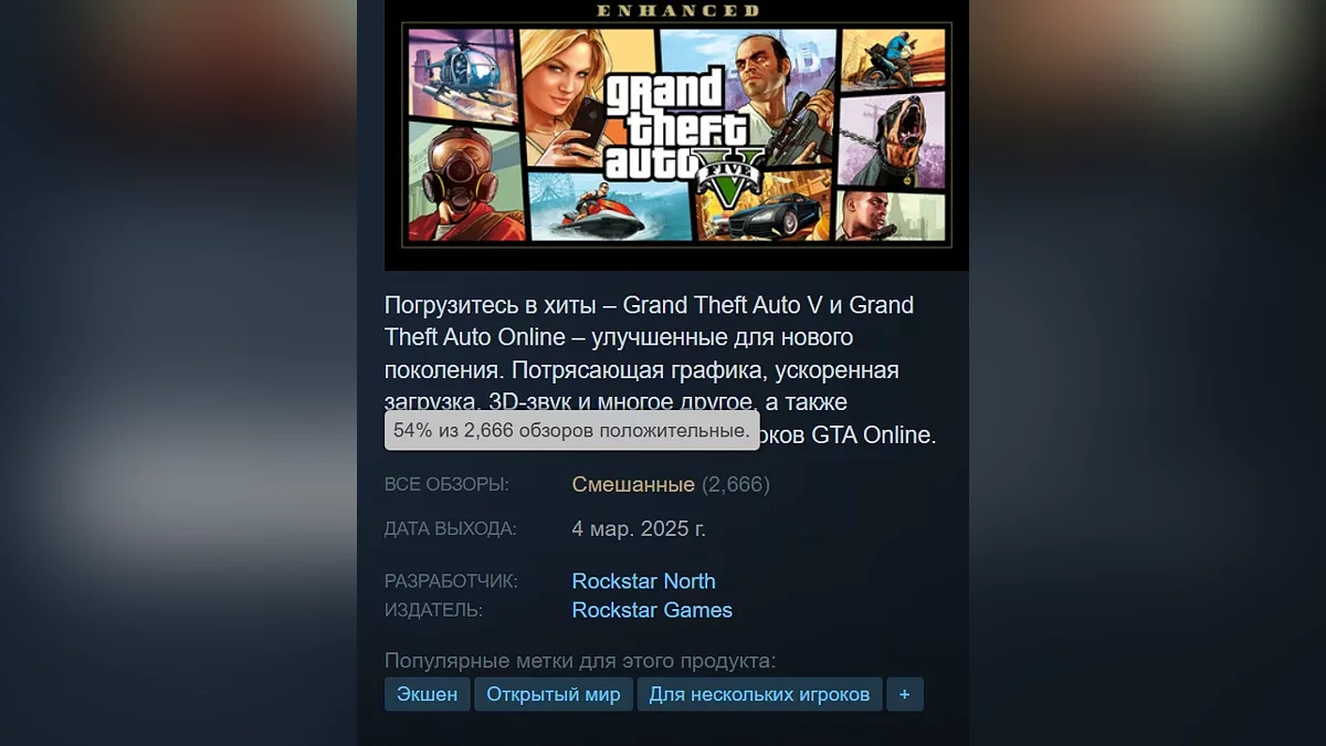 Вышедшая 4 марта Grand Theft Auto 5 Enhanced не смогла впечатлить игроков и получила массу негативных отзывов в Steam. На момент публикации новости её рейтинг в Steam составляет всего 54%.