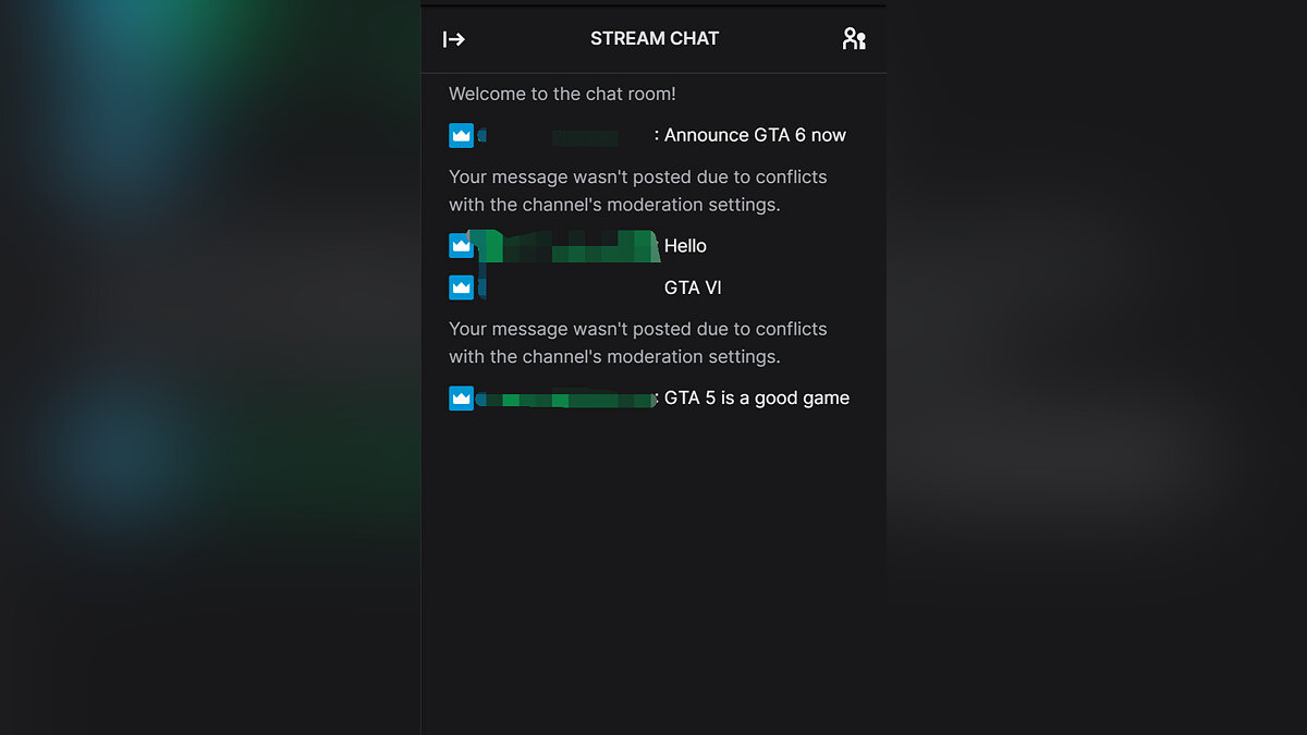 Когда пользователь хочет написать что-то про игру, он видит такой текст: «Cообщение не было опубликовано из-за конфликтов с настройками модерации канала». Rockstar Games внесла GTA 6 в список неприемлемых для чата слов.