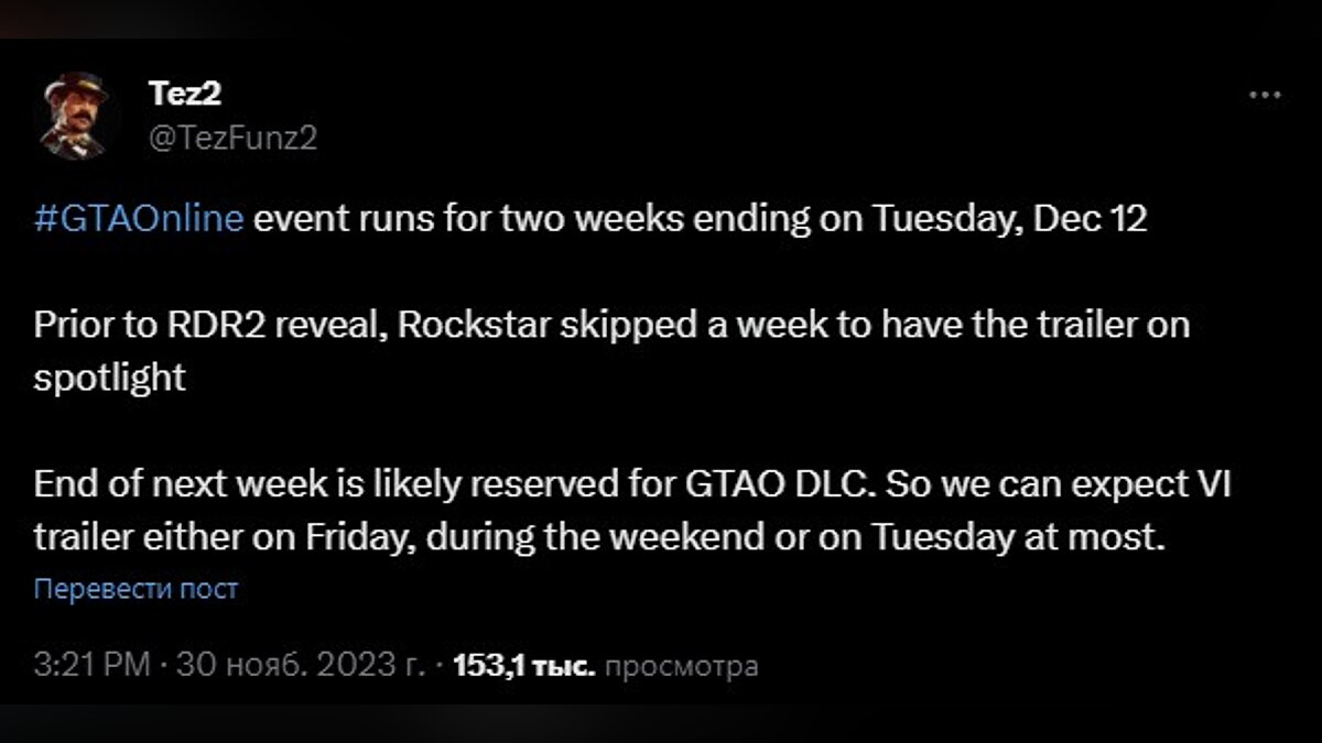 «Событие в GTA Online продлится две недели и закончится во вторник, 12 декабря. Перед анонсом RDR2 разработчики пропустили неделю, чтобы трейлер был в центре внимания. Конец следующей недели, вероятно, отведен под выход дополнения для GTA Online. Таким образом, мы можем ожидать трейлер шестой части либо в пятницу, либо на выходных, либо самое большее во вторник», — написал Tez2.