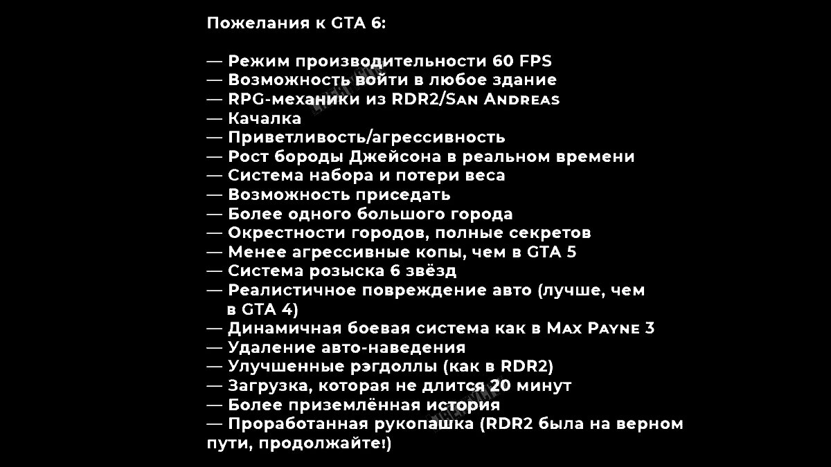 Так, пользователь с ником Synth Potato опубликовал в соцсетях свой список пожеланий к GTA 6: