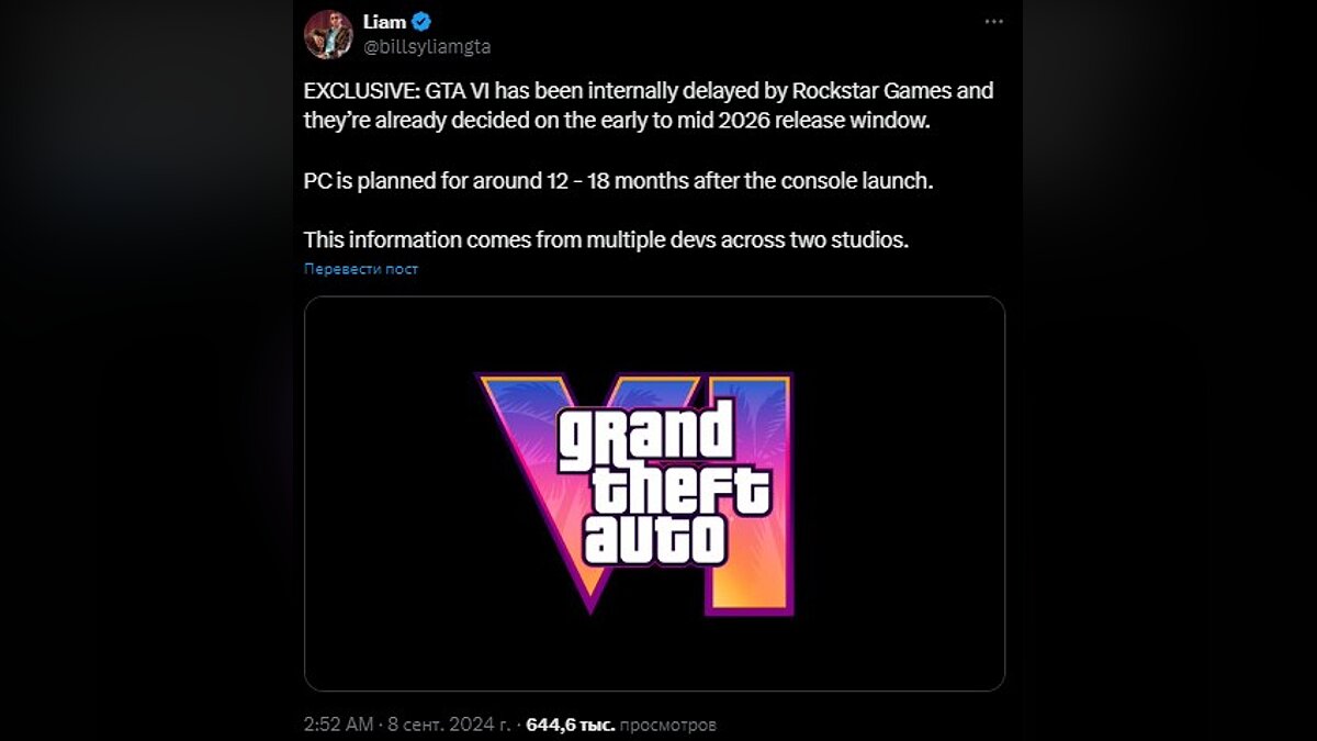 По данным портала GTA Base, который ссылается на источники внутри студий Rockstar Games, релиз GTA 6 могли сдвинуть на 2026 год. Предположительно, игру выпустят в самом начале или ближе к середине года.