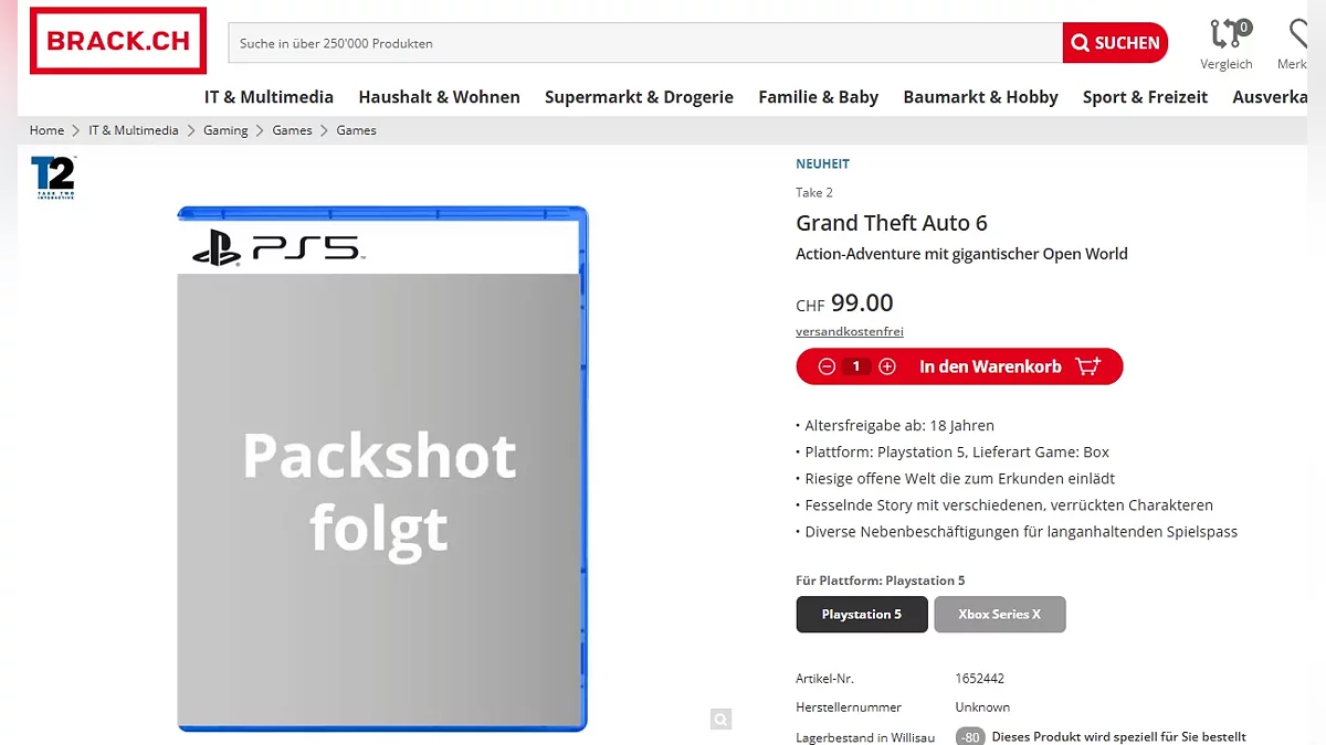 В сети снова всплыла информация о высокой цене Grand Theft Auto 6. На днях популярная швейцарская сеть магазинов Brack запустила сбор предзаказов на игру за 99 франков, что равно 112 долларам (9600 рублей). Пока неизвестно, правдивая ли это цена или стандартный плейсхолдер.
