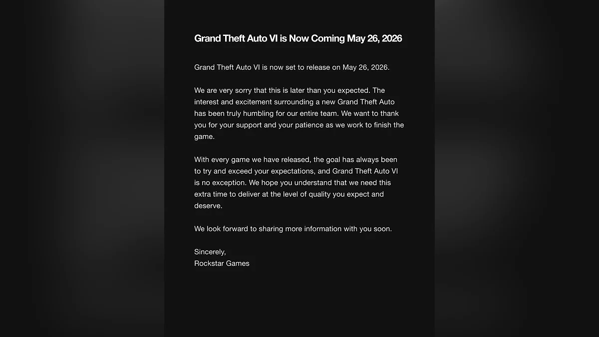 Rockstar Games официально объявила о переносе Grand Theft Auto 6 на 2026 год. Теперь криминальный экшен выйдет следующей весной 26 мая вместо осени этого года, как планировалось ранее.