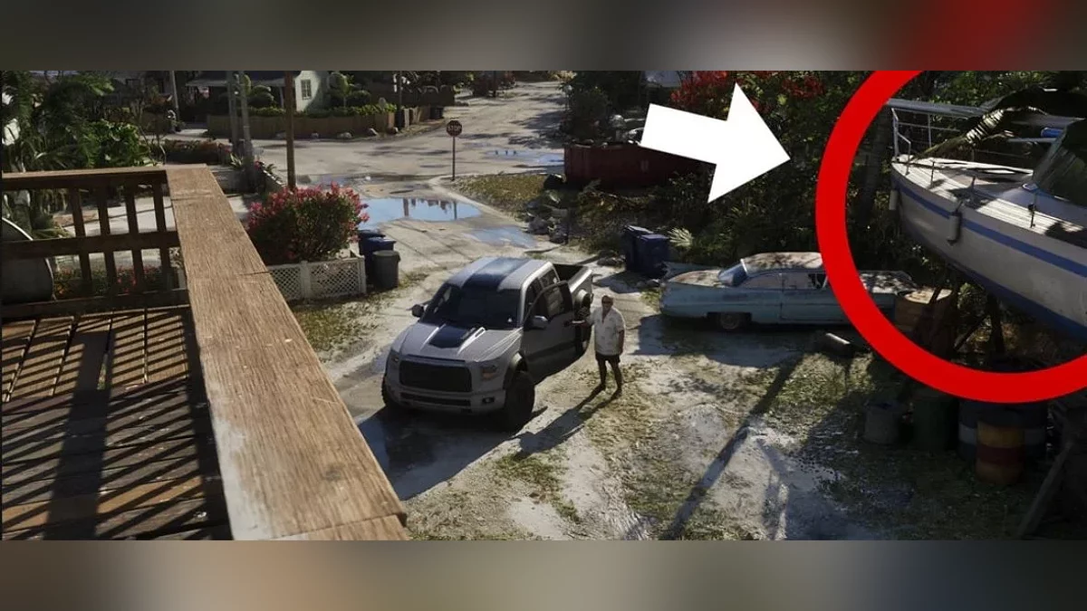 Скриншотами поделился пользователь с ником TGGonYT. Судно припарковалось во дворе у протагониста GTA 6 Джейсона, заметить его можно в самом начале видео. Модель практически точь-в-точь взята из предыдущей игры – лишь поплавки другого цвета.