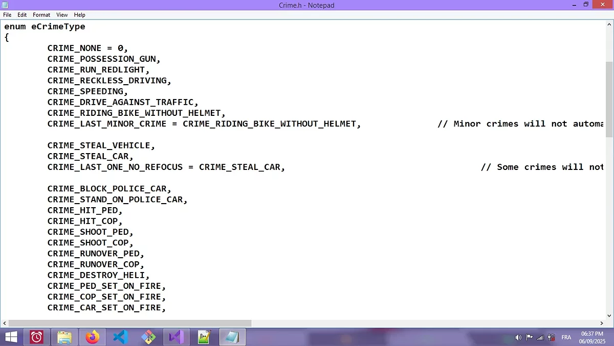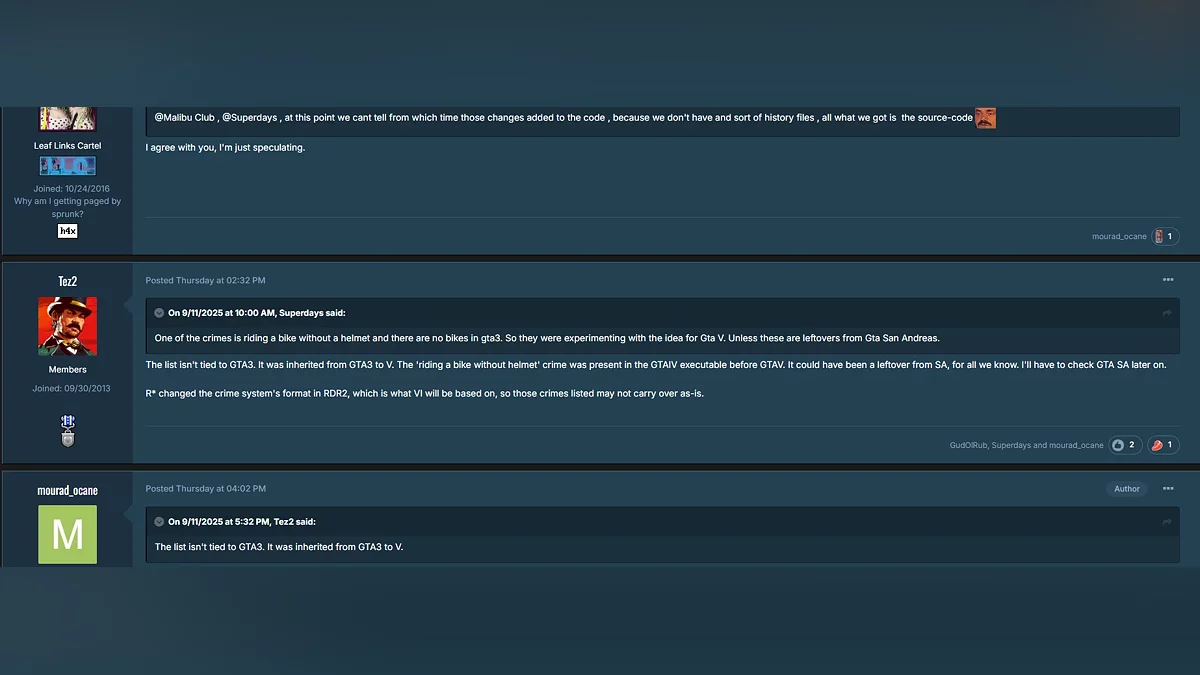 Об этом датамайнер заявил на одном из фанатских форумов во время обсуждения исходного кода Rage Engine за 2022 год. Один из пользователей обнаружил незадействованные функции вроде штрафа за превышение скорости в файлах GTA 5, и многие поклонники высказали мысль, что нечто подобное может перекочевать в шестую часть. Tez2 опроверг их догадки заявлением: «R* изменила формат системы преступлений в RDR2, на которой будет основана VI, поэтому перечисленные преступления могут не быть перенесены в исходном виде».