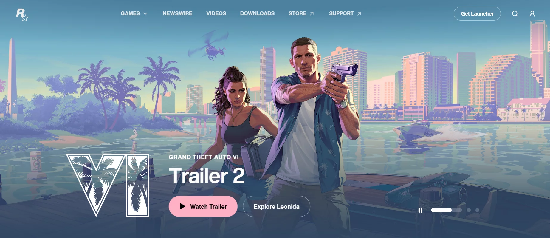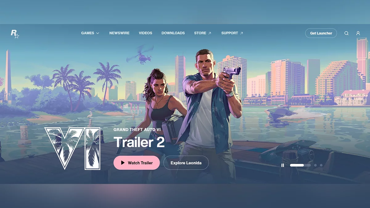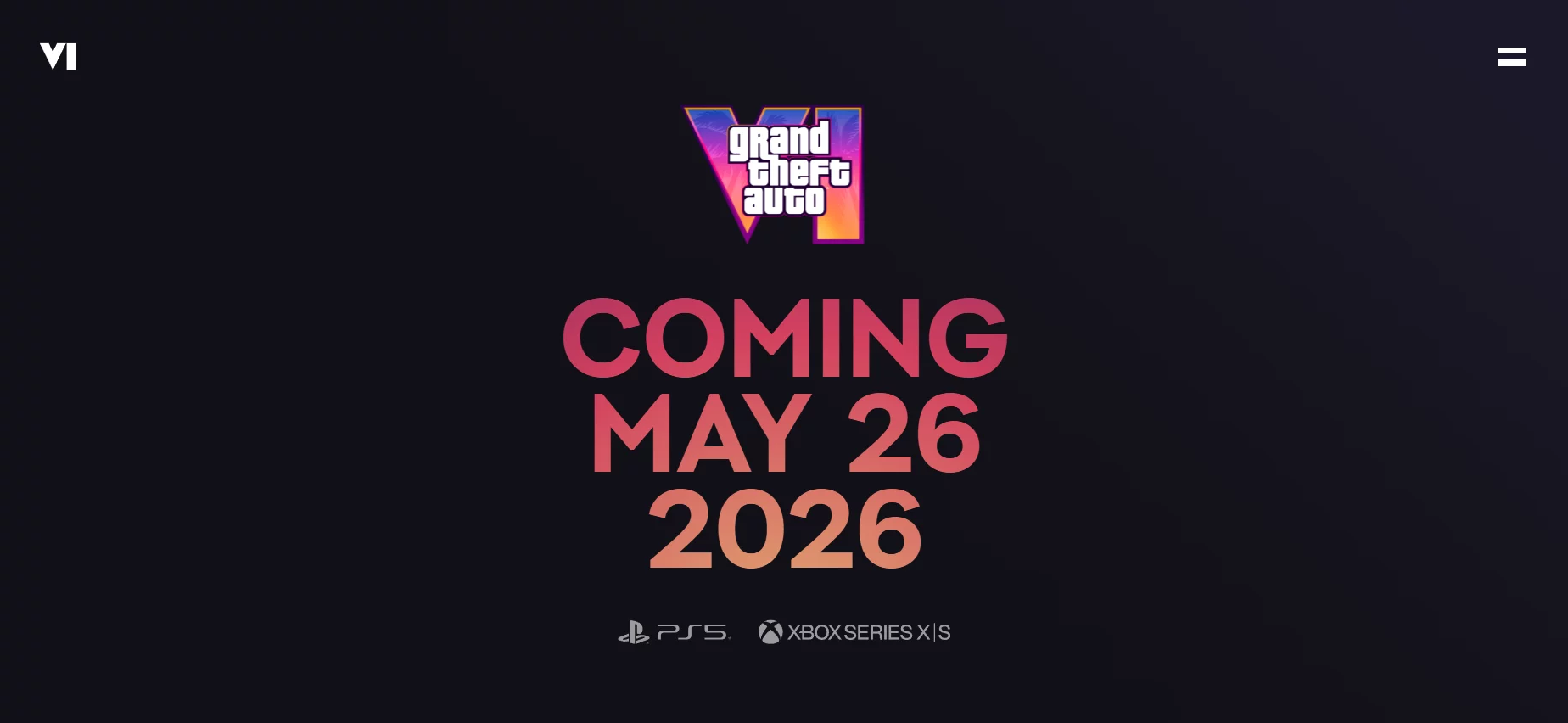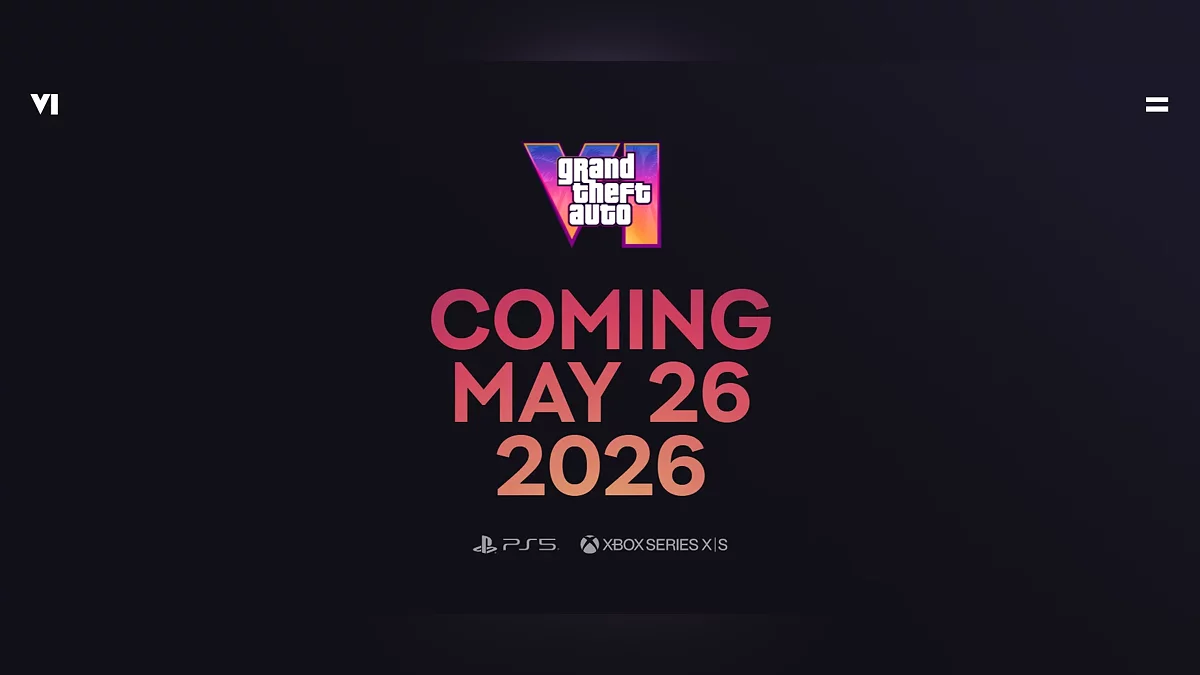 На главном экране отображается большой баннер GTA 6 с двумя главными героями и римской цифрой VI с пальмами в качестве фона. При переходе на страницу появляется крупная надпись: Coming May 26 2026 (выйдет 26 мая 2026 года). Ниже расположена информация о персонажах с анимированными артами при скроллинге.