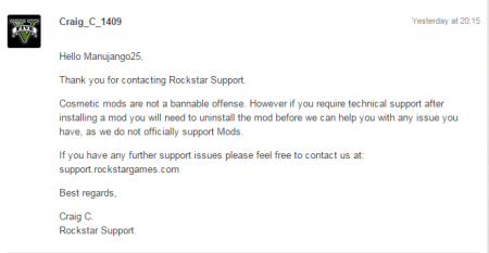Другой пользователь опубликовал официальный ответ службы поддержки Rockstar, которая сообщила, что не будет разбираться с проблемами, возникшими при использовании модифицированной игры, потому что официально разработчики не поддерживают моды.