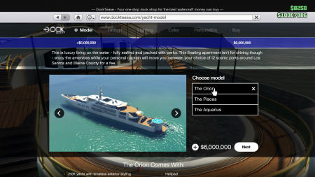 Те, кого не устраивает перспектива при взгляде в окно видеть всякий раз одно и то же, могут приобрести на сайте Docktease супер-яхту. Яхты выполняют роль плавучих апартаментов, и они поставляются уже с экипажем: у вас будет свой капитан, готовый по вашему распоряжению доставить судно в любое из 12 живописных мест на территории Лос-Сантоса и округа Блэйн, а также личный бармен, обслуживающий вас и ваших гостей. Существуют разные варианты комплектации: яхты высокого класса оснащены массажными ваннами и вспомогательными средствами передвижения, в том числе вертолетами и гидроциклами. Вы сами выбираете название корабля и флаг, под которым он будет плавать, а также цвет корпуса и освещение. Все яхты оснащены системой ПВО, защищающей вас от нападений конкурирующих организаций и других игроков.