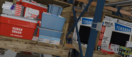 Слева мы видим какие-то медицинские препараты и контейнер для переноски человеческих органов. Справа мы видим электронику: телевизор, наушники, смартфоны.