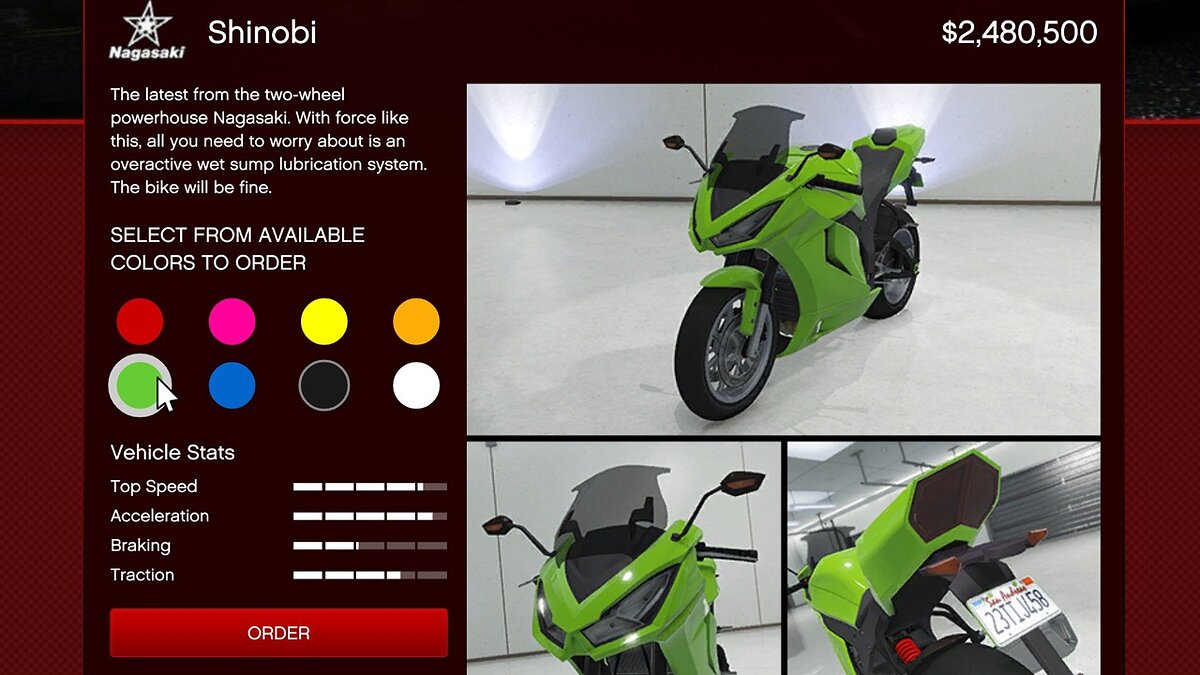 Мотоцикл стоит 2.480.500 GTA$, но при этом не является самым быстрым в игре.Он вдохновлен японским спортивным байком Kawasaki Ninja. Купить Nagasaki Shinobi можно в Legendary Motorsport.