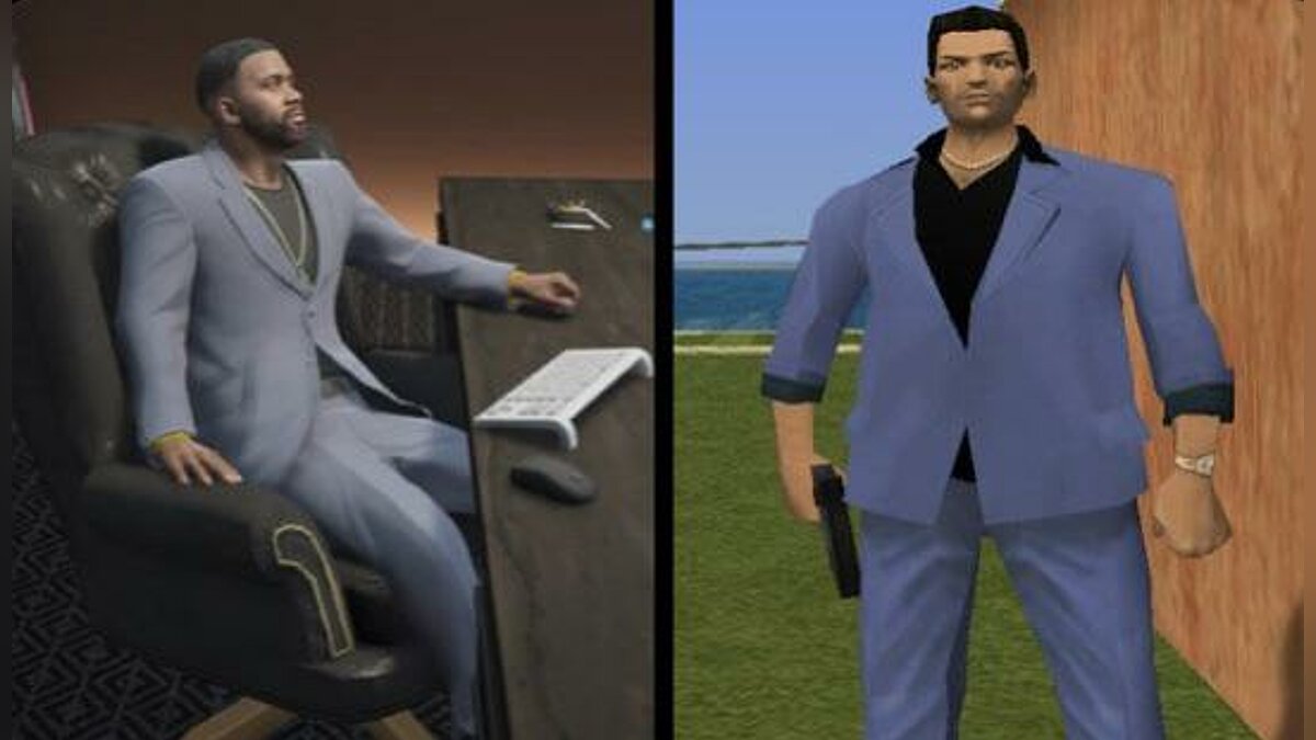 Пользователь Reddit c ником Gromitmugman117 нашел любопытную пасхалку в GTA Online. Костюм взрослого Франклина напоминает тот, что носил Томми Версетти в GTA Vice City. Герой дополнения GTA Online: The Contract так же носит синий костюм с черной рубашкой и мокасинами.