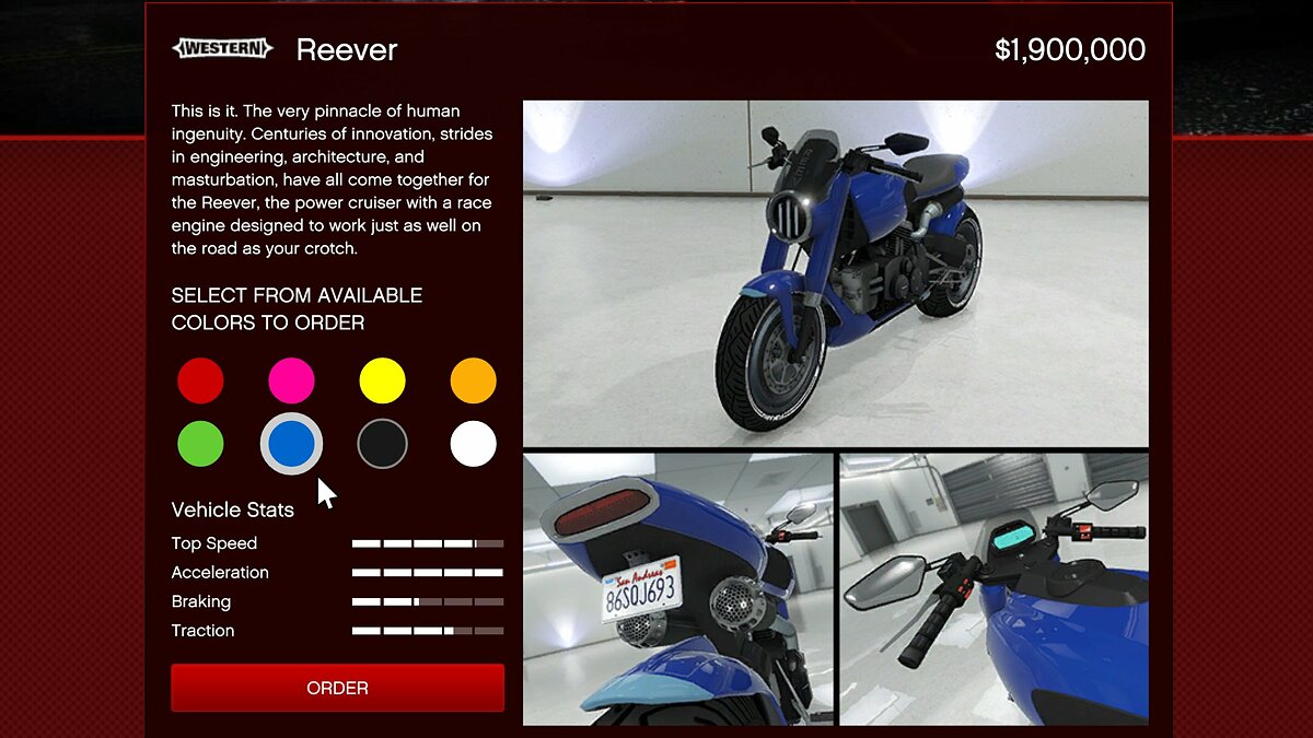 Название мотоцикла отсылает к известному актеру. Мотоцикл — Reever, фамилия актера — Reeves. Для байка даже раскраска специальная есть с буквами REEV. Стоит мотоцикл 1.900.000 GTA$. Купить его можно в Legendary Motorsport.