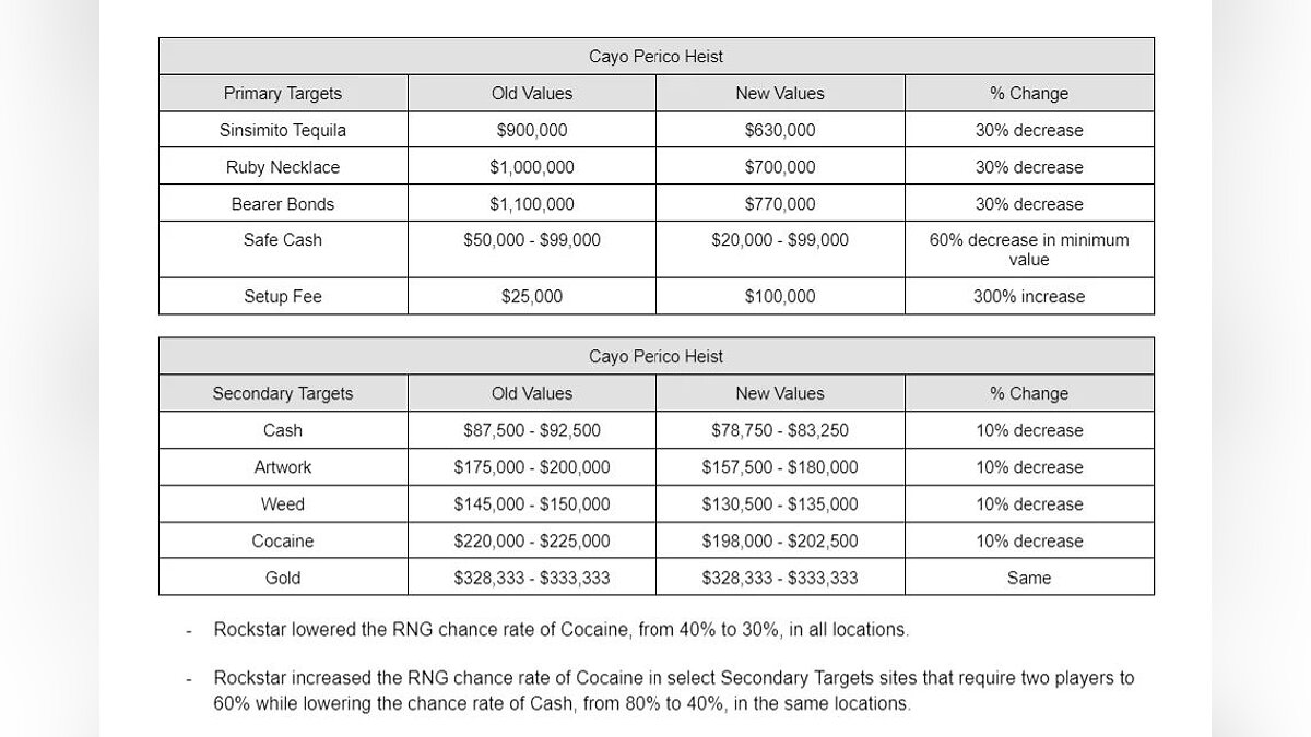 Rockstar выпустила небольшое обновление для GTA Online, где изменила выплаты за ограбление Кайо-Перико. Теперь игроки будут получать меньше денег за выполнение основных и дополнительных задач.